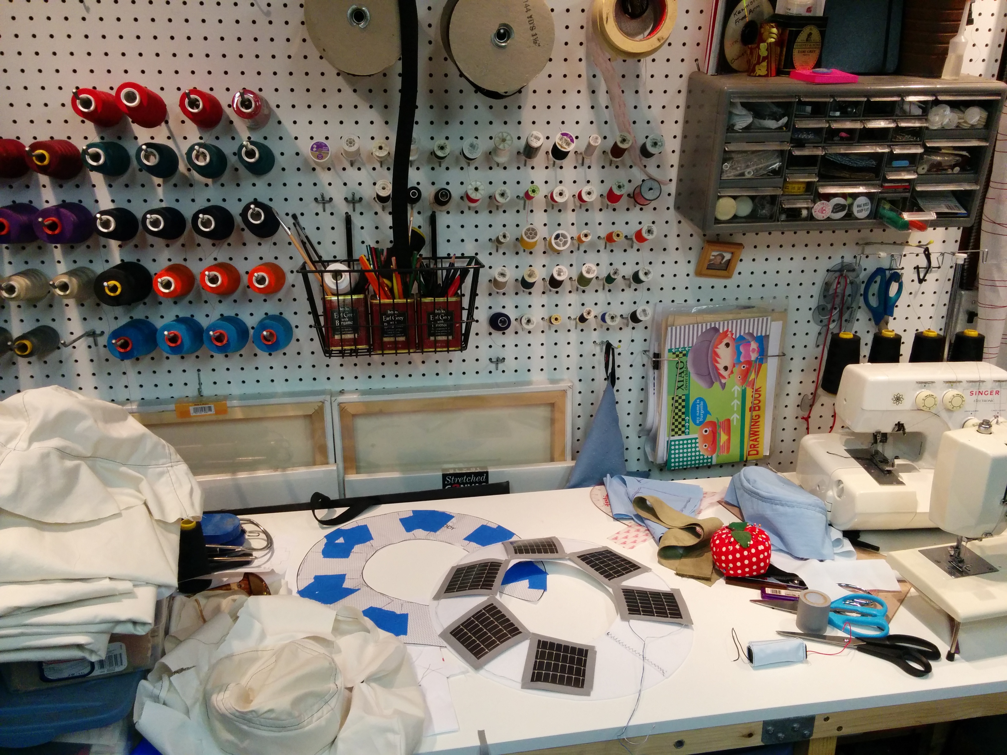 I made a couple prototypes of boonie hat designs and panel configurations. I soon realized that it’s more streamlined to wire the panels side-to-side than end-to-end. This requires a broader brim and we had to weigh the pros and cons. A major pro: We’ll be above the timberline for much of our hike, so bigger brims will be welcome for the extra shade. The only real con: they are a bit less stylish. Utility outweighed pride and we went with the wide brims. Besides, backcountry nerdcore is kind of awesome.